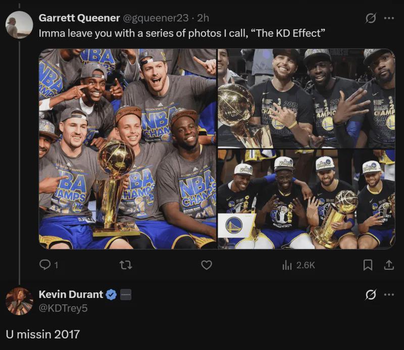 在2016-17赛季,杜兰特宣布加盟金州勇士,并随队拿到两个NBA总冠军,个人两连FMVP。但之后勇士球员追梦格林在与杜兰特的冲突中说出的那句“你来之前我们已经是冠军了!”,引发杜兰特离开勇士,随后辗转联盟。